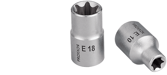 | 1/2'' - Außen-TX-Einsatz Hergestellt aus CrV-Stahl. | E 10NO 23 380 E 12NO 23 382 E 14NO 23 384 E 18NO 23 388 E 20NO 23 390 |