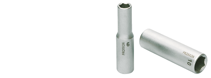 | 3/8'' - Tiefbett-Steckschlüsseleinsatz Für lang überstehende Gewindebolzen. Hergestellt aus CrV-Stahl. Gesamtlänge 46 mm. | 8 mmNO 23 532 9 mmNO 23 534 10 mmNO 23 536 11 mmNO 23 538 12 mmNO 23 540 13 mmNO 23 542 14 mmNO 23 543 |