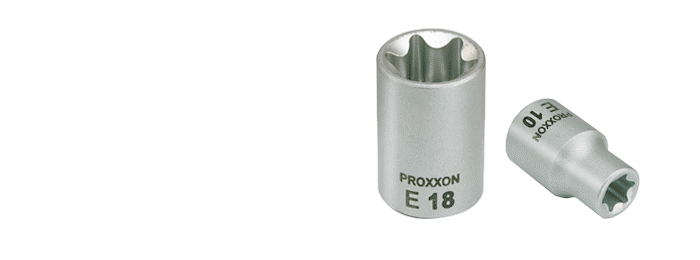 | 3/8'' - Außen-TX-Einsatz Hergestellt aus CrV-Stahl. | E 6NO 23 612 E 7NO 23 613 E 8NO 23 614 E 10NO 23 616 E 12NO 23 618 E 14NO 23 620 E 18NO 23 624 |