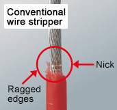 FT-802 can strip the insulation of AWG 38 wire with no nick. | Conventional wire stripper could make ragged edges of insulation or damage strands. |