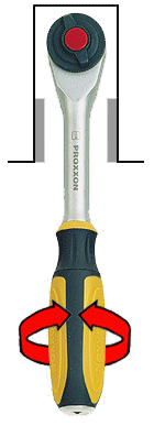 The rotating grip design allows for pre-tensioning in abutment to one side. Then a few millimetres of standard ratcheting action is sufficient for loosening or tightening. Fine tooth drive (52 teeth) with convenient drive direction switch. Sockets are held firmly in place until the quick release button is activated.