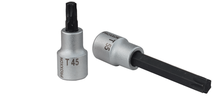 | 1/2'' - TX socket bits, 55mm Head made of chrome-silicon-manganese-molybdenum steel. Socket CrV steel. | TX 20NO 23 488 TX 25NO 23 489 TX 27NO 23 490 TX 30NO 23 491 TX 40NO 23 492 TX 45NO 23 493 TX 50NO 23 494 TX 55NO 23 446 TX 60NO 23 447 TX 70NO 23 448 |