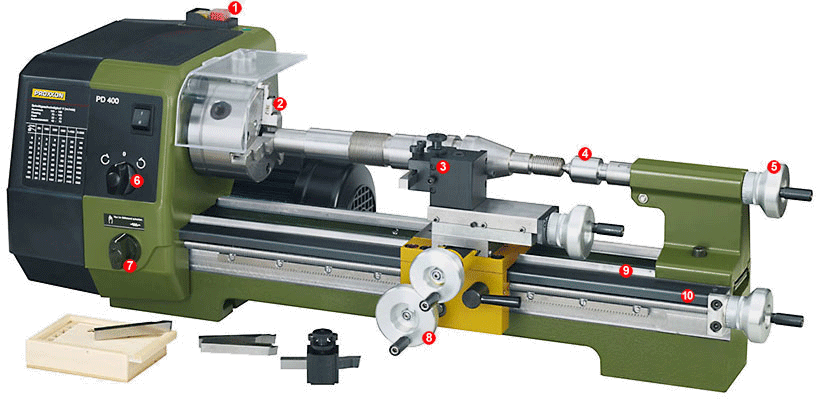 Centre distance 400mm. Swing 85mm. Height over cross slide 58mm. For machining steel, brass, aluminium and plastic. For face and straight turning, taper turning and thread cutting. With an extensive range of system accessories you can also drill, mill and slot.