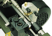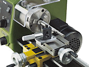 Support: Bed carriage made of die-cast zinc. Cross slide (adjustment 85mm) and top slide (setting range 52mm) of steel. Top slide can be swivelled for taper turning (degree graduation up to 45° available). With multiple tool posts and two tool post elements for quick change and easy height adjustment. For turning tools 10 x 10mm.