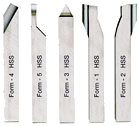 One each roughing out, parting, finishing cut, left and right cutter. Comes in wooden box with sliding lid. 10 x 10 x 80mm.