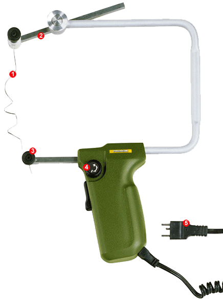 Stabiler Bügel mit schwenkbarem Befestigungselement oben und ausziehbarer unterer Drahtbefestigung. Maximale Gesamtausladung 200 mm. Maximaler Höhendurchlass 150 mm. Schneidedrahttemperatur stufenlos regelbar: Je nach Materialdichte und -stärke kann man mit etwas Übung ein optimales Schnittbild erreichen. Meist bei mittlerer Temperatur und mäßigem Druck. Anheizzeit 1 Sekunde. Komplett mit 5 verformbaren Schneidedrähten 285 x 0,85 mm.
